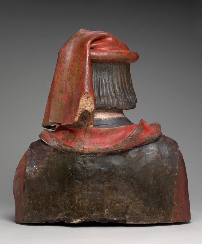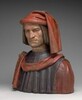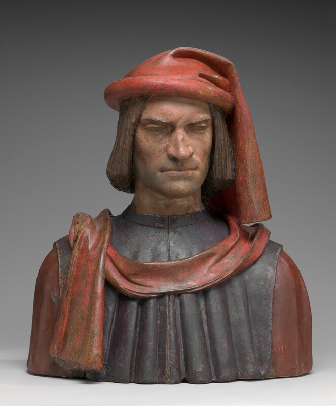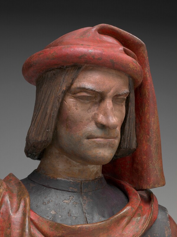 Lorenzo de' Medici, the brilliant, learned, and ruthless head of a wealthy banking family, ruled the Italian city-state of Florence in the Renaissance. This bust may copy a wax statue made to commemorate Lorenzo's survival in 1478, when an assassination plot took the life of his younger brother. The simple costume, with a distinctively Florentine padded and draped headdress, reflects Lorenzo's claim to be merely a respected citizen rather than a de facto prince. Cleaning in recent years (completed 2006) has brought out the original bright reds, warm flesh tones, and a light beard. The brooding face suggests the forceful intelligence behind Lorenzo's power. This haunting likeness may have been molded from his death mask.