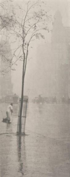 These New York photographs, though, were not only exercises in form. Made along the waterfront and depicting the city from a distance, they impart a sense of passage, transition, and psychological separation. As in The City across the River or The City of Ambition, Stieglitz anchored his viewer on the opposite shore, removed from the new city (Key Set numbers 337 and 341). Even in Old and New New York, where a person in the middle ground surveys the scene, Stieglitz separated himself, and thus the viewer, from the spectacle by a sidewalk, curb, and hedge (Key Set numbers 344 and 345). We, like Stieglitz, witness from afar the construction of a new skyscraper in the background but are not part of the life of the street. Even the photogravure prints that Stieglitz made of these works between 1910 and 1913, while far less atmospheric than his views from the turn of the century, are nevertheless dark and heavy, further contributing to a sense of pause and reflection.