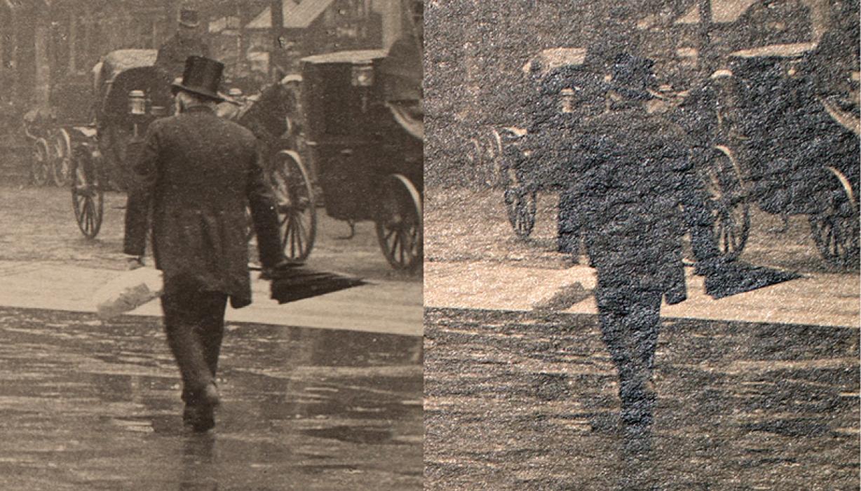 Detail of A Wet Day on the Boulevard, Paris, in normal light (left) and specular light (right). The detail in specular light illustrates the rough texture of the paper.