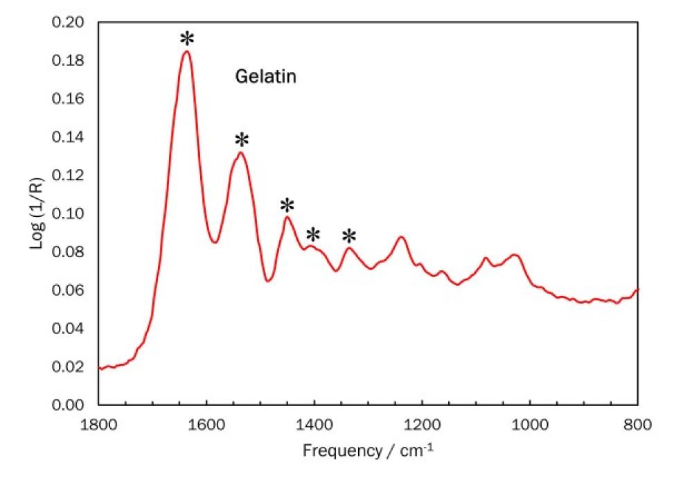 The ATR-FTIR spectrum shows peaks characteristic of gelatin, indicated with an asterisk (*) in the figure.