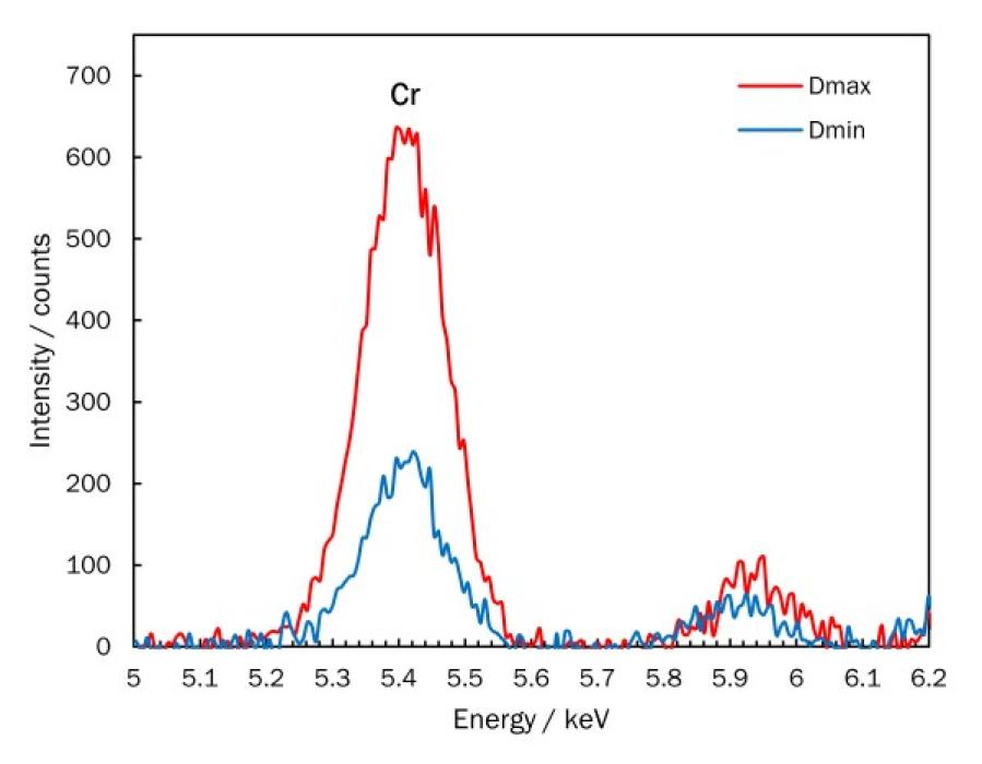 The signal for chromium (Cr) detected by XRF is more intense in the darker image areas (Dmax) than in lighter image areas (Dmin).
