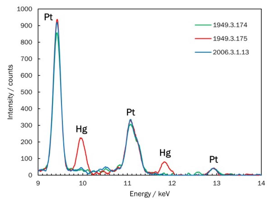 This detail of the XRF spectra for the three prints of Sunlight Effect, Gutach shows that all three contain platinum (Pt) as the primary image metal. Only the sepia-hued print (1949.3.175, Key Set number 185) also has mercury (Hg) in the print, which gives it its warm hue.
