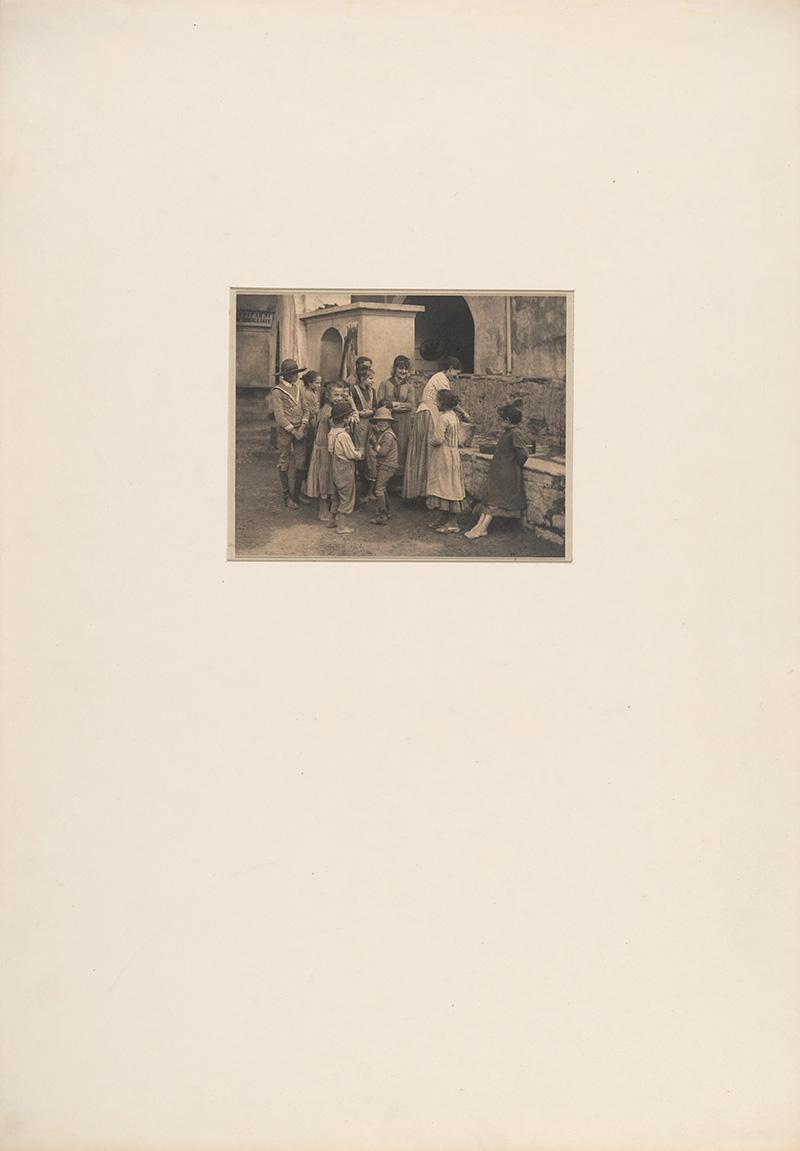 Around 1910, when he was preparing the large (approximately 13 1/4 × 10 1/4-inch) photogravures that he made at this time, Stieglitz dry-mounted the print onto a cream board and covered it with a cream window mat (often 25 × 18 1/2 inches), leaving a space of 1/4–1/2 inch around the print. For vertical prints, he frequently left twice as much space at the bottom than at the top.