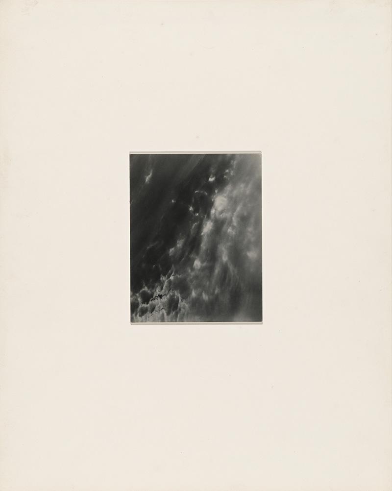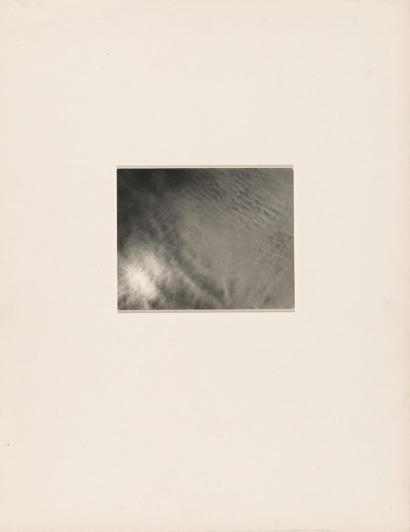 With his photographs of clouds made from 1923 to 1934, Stieglitz usually dry-mounted the print to the back of a rejected print (to keep it from curling), which he then dry-mounted to a thin, white paper board. He trimmed the mounted print to the edge of the image and adhered it onto a light cream board. For those photographs made with his 4 × 5-inch camera, he usually used a board that was 13–14 inches high and around 10 3/4 inches wide. For vertical prints, he usually placed them slightly above the center; for horizontal prints, he usually left about 1 inch more at the bottom than at the top.